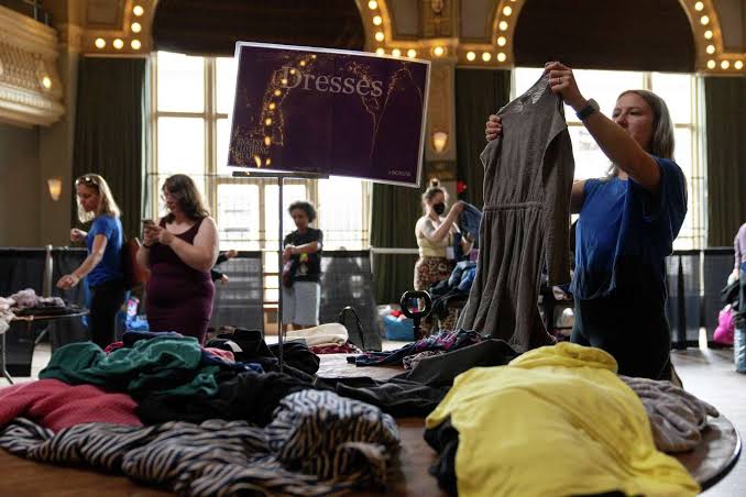 That initial swap attracted about 150 people. Now, the twice-yearly event draws between 500 and 850 participants to share clothes and accessories in a party-like atmosphere.